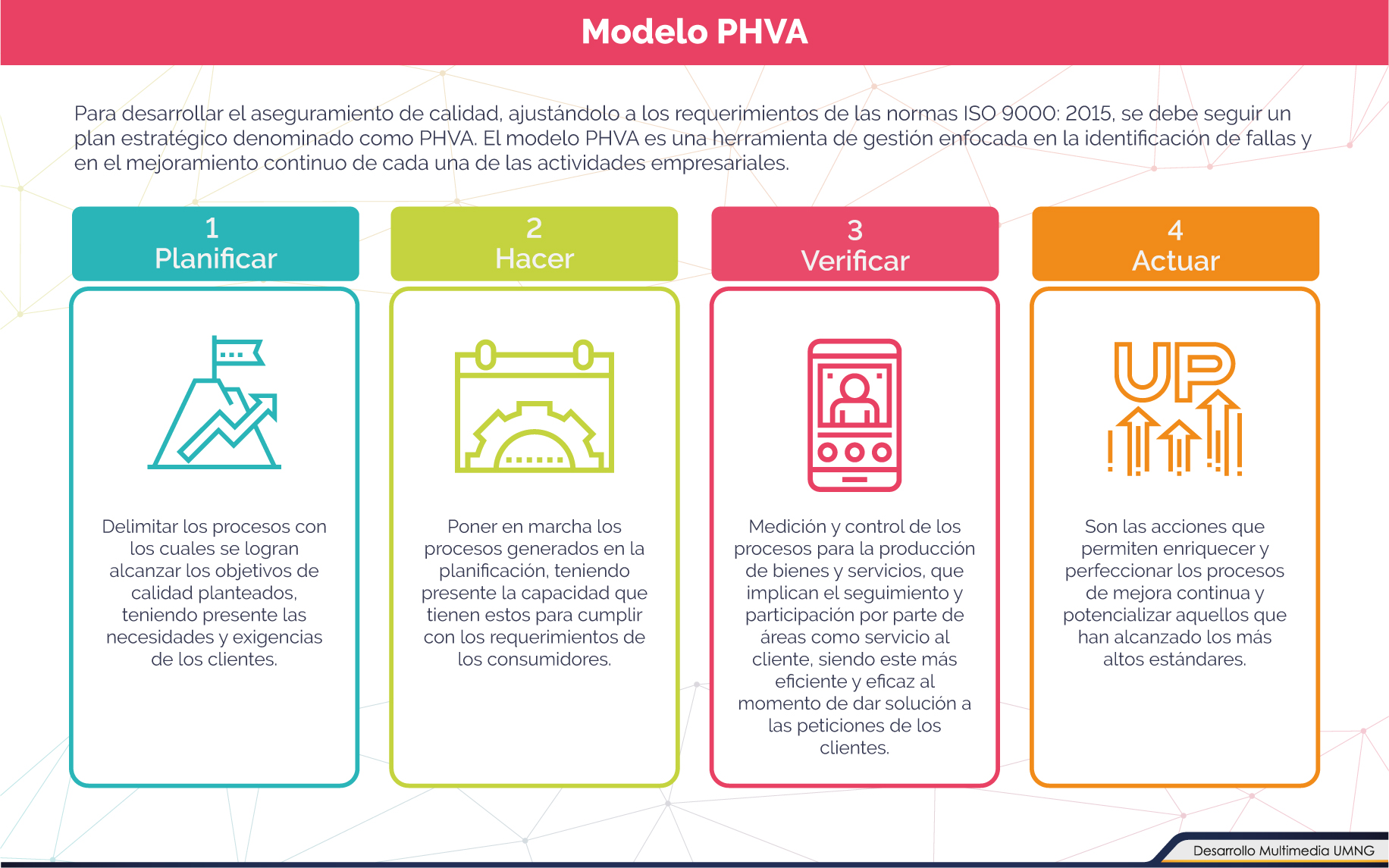 De igual forma, presentando sus características como el control de calidad, prevención de fallos, rediseño de productos, homogeneidad y conformidad de productos o servicios y, por último, la capacitación y responsabilidad del personal. Adicionalmente, especificando los modelos aplicables a los procesos de aseguramiento de la calidad.