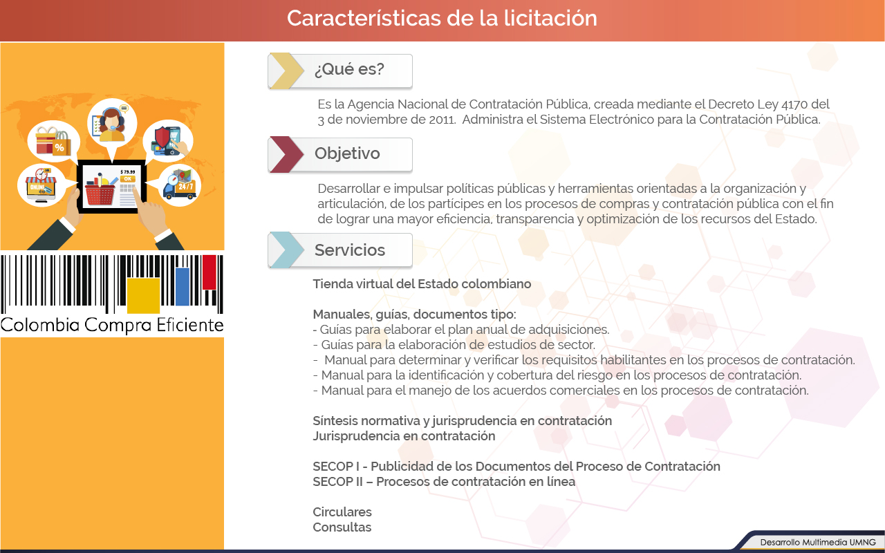 - Gobierno de Colombia. (8 de 07 de 2019). Colombia Compra Eficiente. Recuperado de: https://sintesis.colombiacompra.gov.co/content/definici%C3%B3n-contrato-estatal