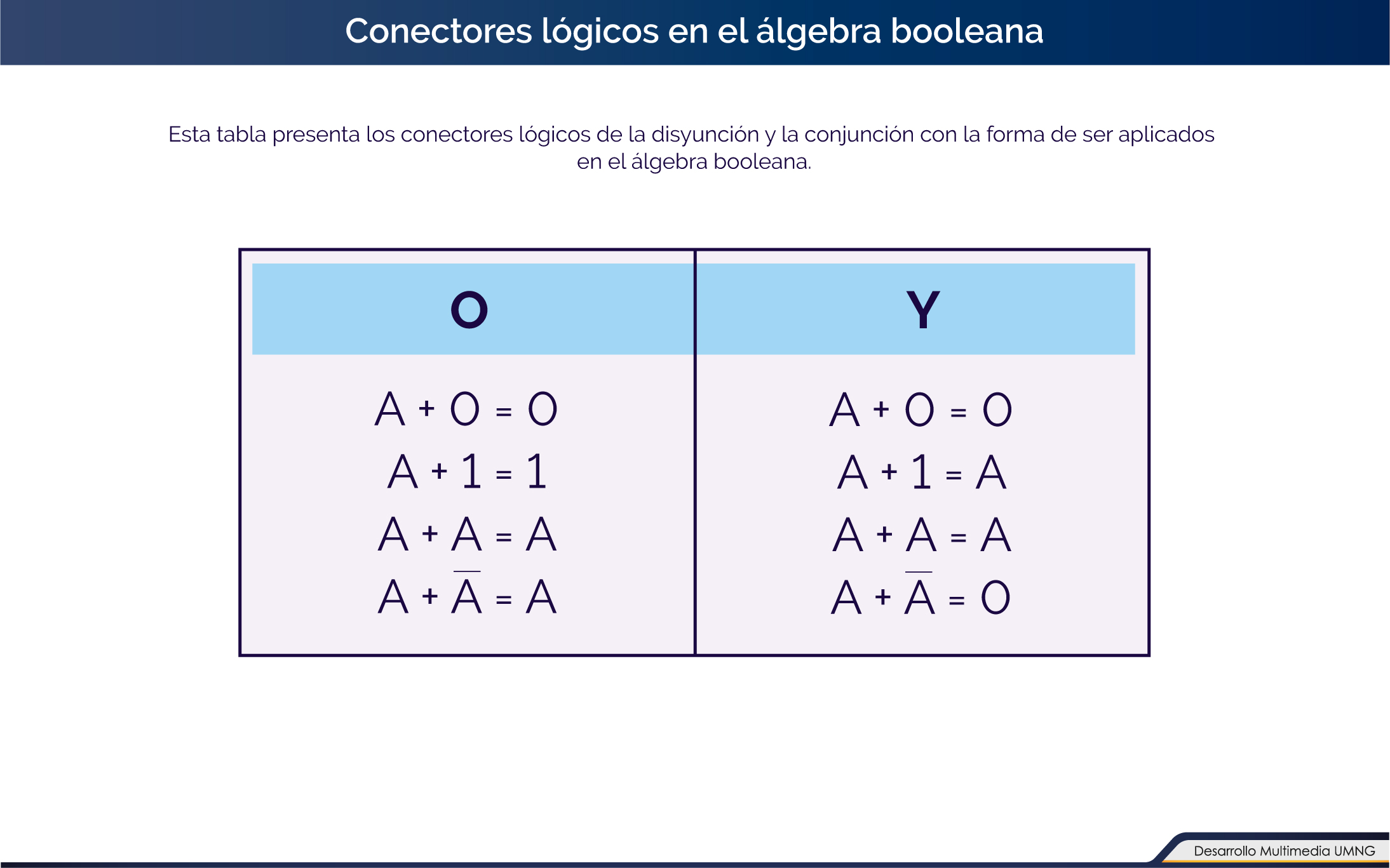 En 1987 George Boole publicó el primer trabajo en el que formalizaba el “álgebra booleana”, que es una estructura que tiene sus bases en los conectores lógicos descritos anteriormente y que relacionaba las operaciones entre conjuntos (unión, intersección y complemento) con algunos conectores lógicos (y, o, o exclusiva, no). Boole enlazó sus conocimientos lógicos con los algebraicos: tomó dos proposiciones y, según su valor de verdad, les designó “0” o “1”, después, aprovechando las leyes de Morgan, dedujo las tablas de verdad.