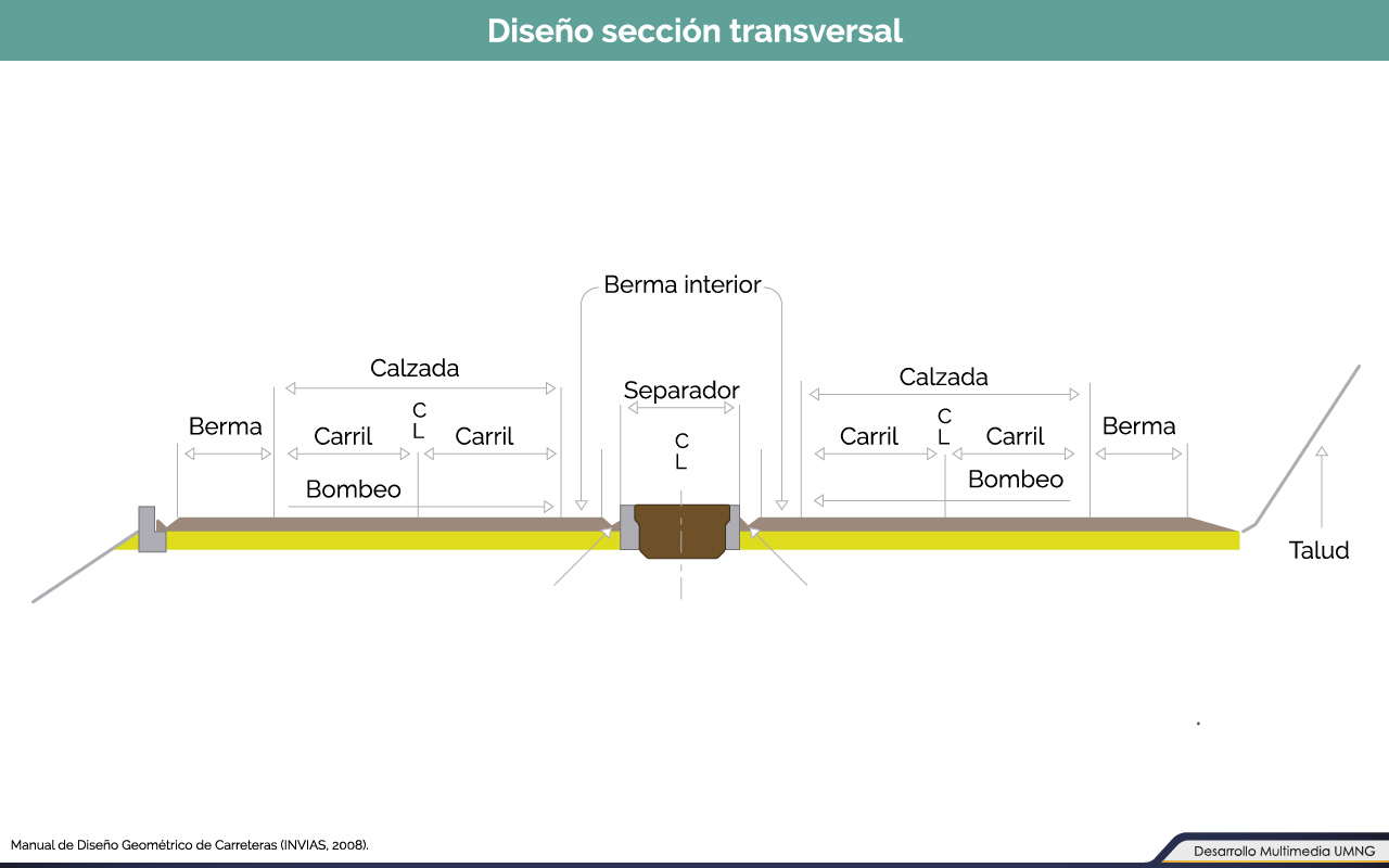 En esta unidad se describieron cada uno de los elementos que componen la sección transversal de una vía, y se desarrollaron cada uno de los criterios para la definición de estos de acuerdo al tipo de vía o a la velocidad de diseño.