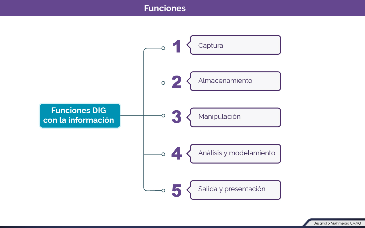 Las funciones básicas de cualquier SIG se encuentran enmarcadas dentro cinco parámetros básicos. Estos aspectos se encuentran presente en cualquier aplicación SIG en mayor o menor cuantía, dependiendo su nivel de implementación y objeto final como aplicación; estas funciones son: