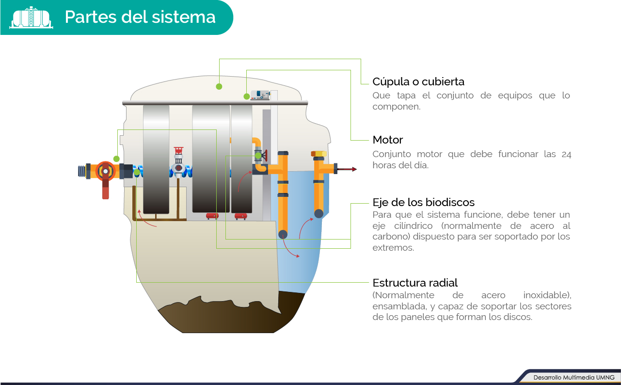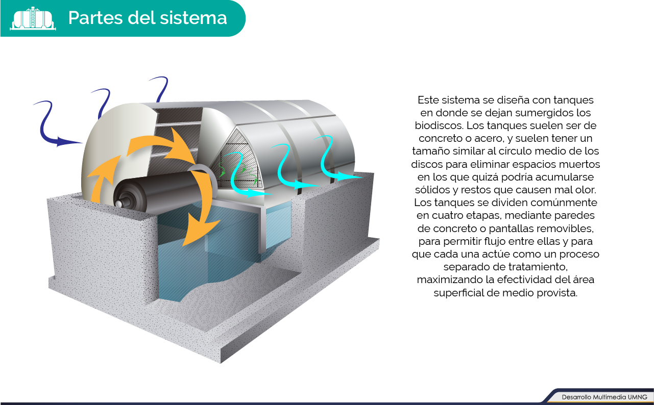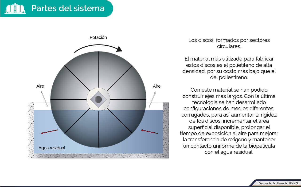 Este sistema secundario de tratamiento de agua, consiste en unos discos rotatorios, cuyo material puede ser madera, polietileno corrugado, poliestireno corrugado y pvc, los cuales giran en torno a un eje horizontal. Los discos están colocados dentro de una estructura generalmente de concreto llena de agua residual a tratar.