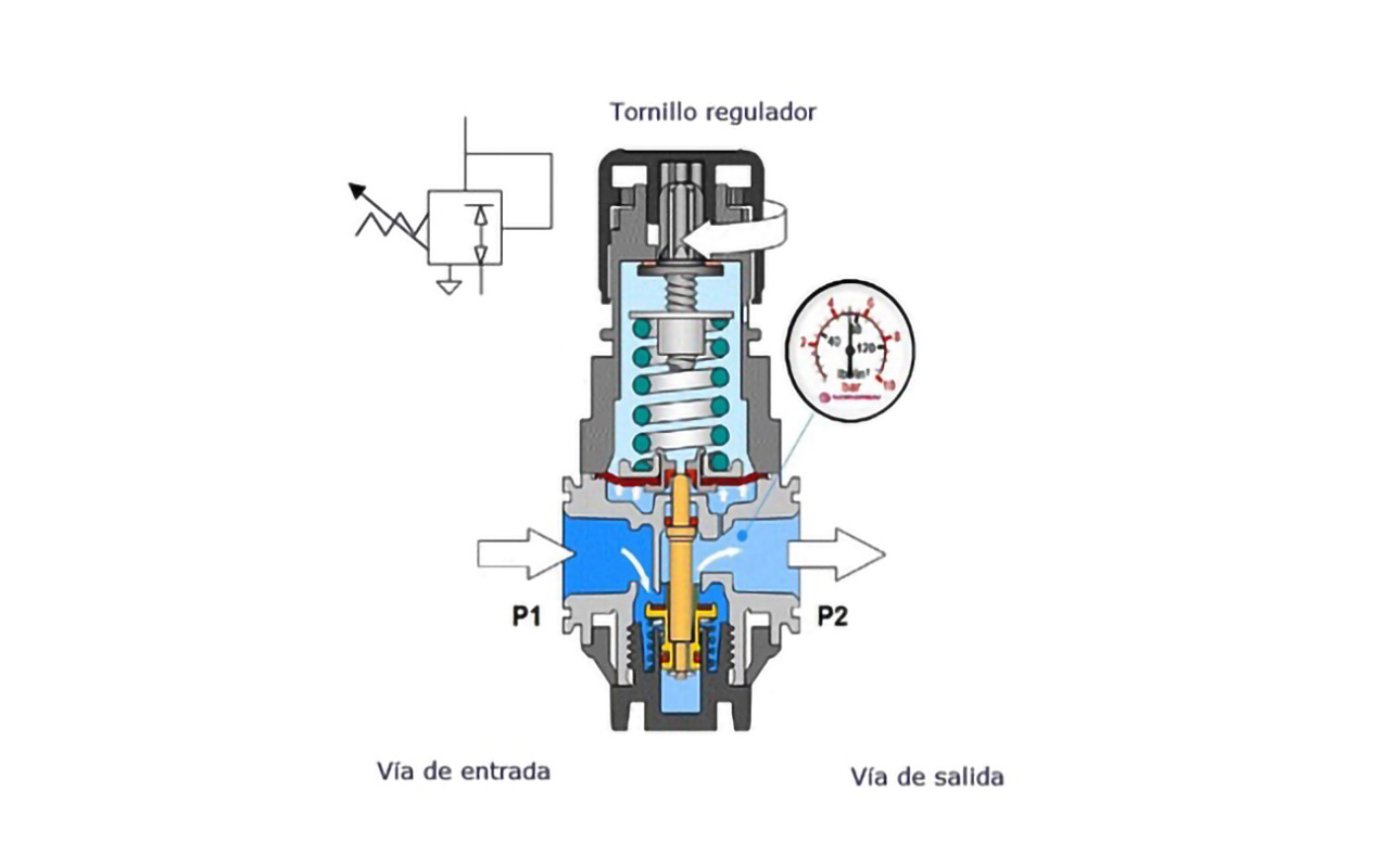 Las válvulas reguladoras de presión tienen la misión de mantener constante la presión en su salida independientemente de la presión que exista a la entrada. Tienen como finalidad fundamental obtener una presión invariable en los elementos de trabajo independientemente de las fluctuaciones de la presión que normalmente se producen en la red de distribución. La presión de entrada mínima debe ser siempre, obviamente, superior a la exigida a la salida.