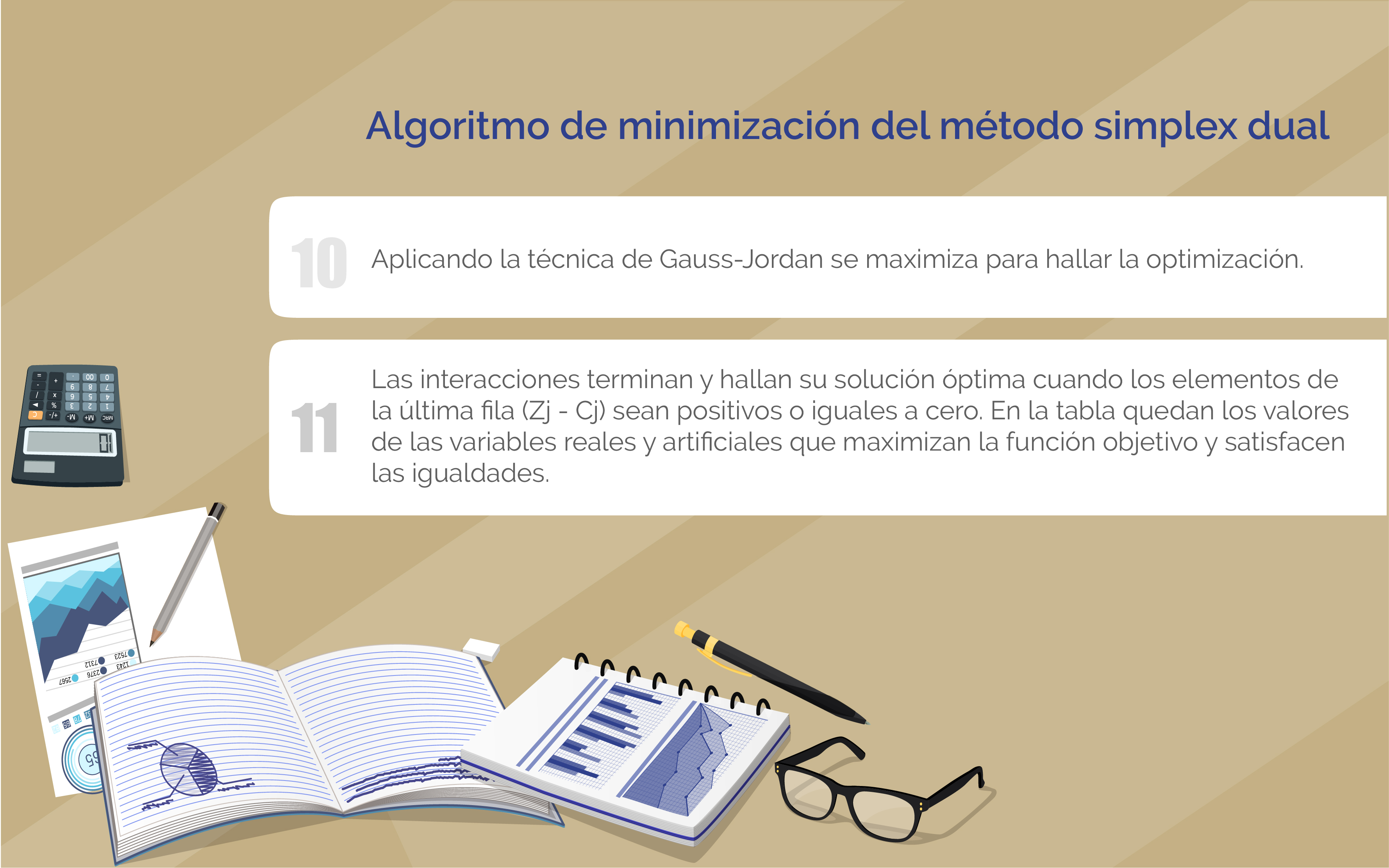 El método simplex dual trabaja con tablas llamadas iteraciones en las que se aplica la técnica de Gauss-Jordan que «es un algoritmo del álgebra lineal para determinar las soluciones de un sistema de ecuaciones lineales, encontrar matrices e inversas» (s. n., 2013).
