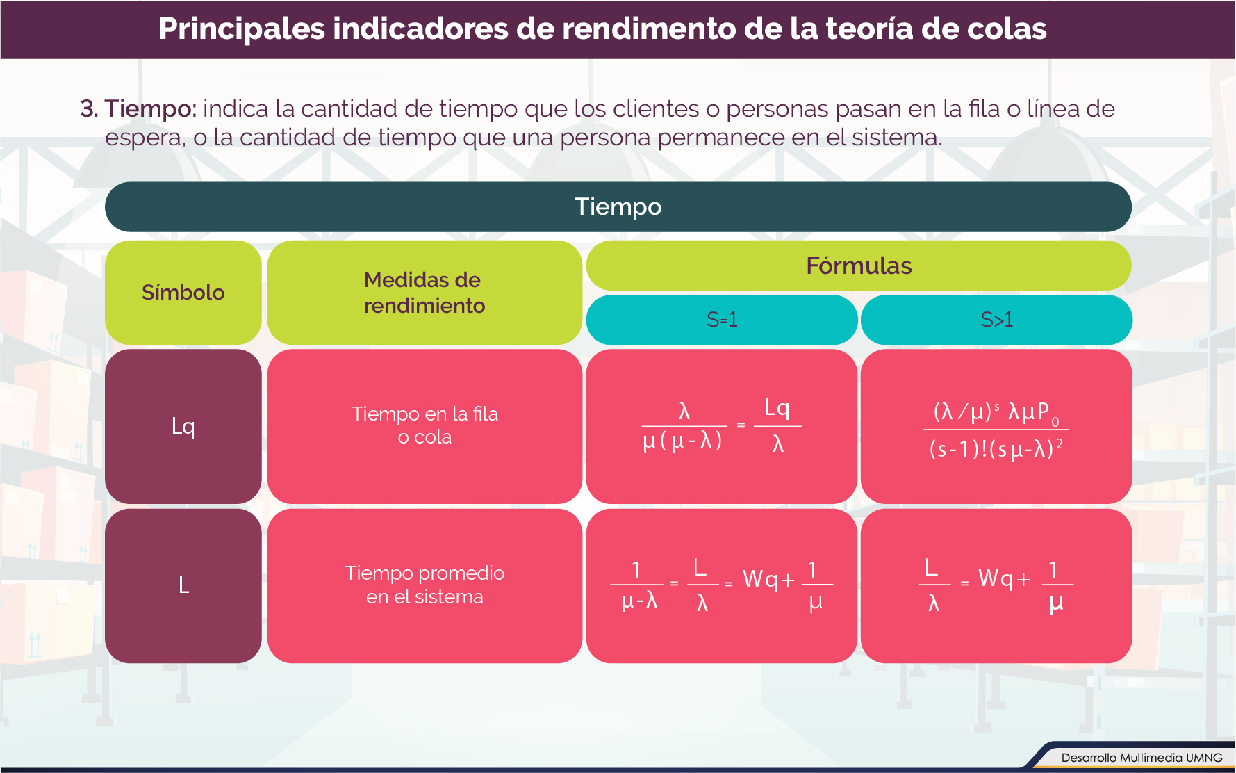 - Aplicar los indicadores de rendimiento a la teoría de colas.