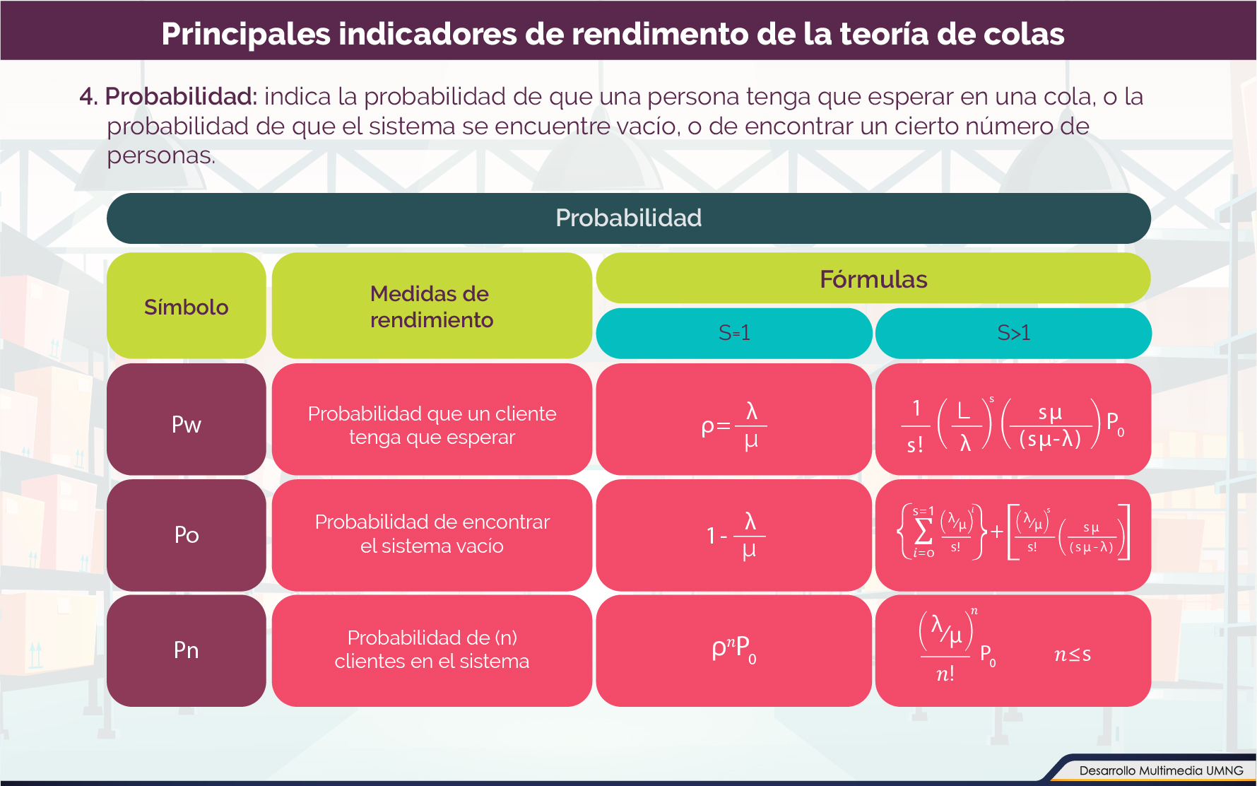 - Probabilidad: indica la probabilidad de que una persona tenga que esperar en una cola, o la probabilidad de que el sistema se encuentre vacío, o de encontrar un cierto número de personas (Winston, 2005).