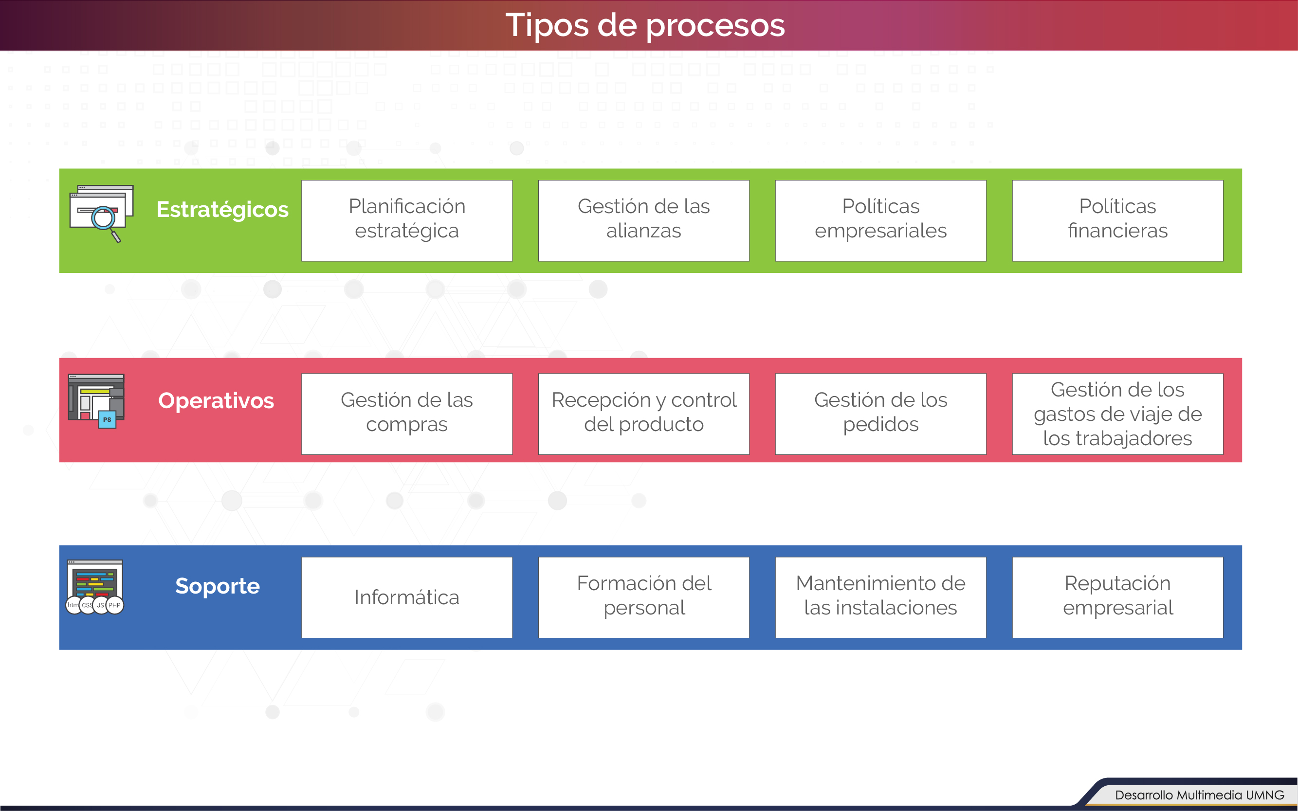 - Dar a conocer los conceptos básicos de la teoría de procesos, el mapa de procesos de una organización, sus niveles, tipos de procesos y su importancia en la toma de decisiones, la ejecución del plan estratégico y la mejora continua.