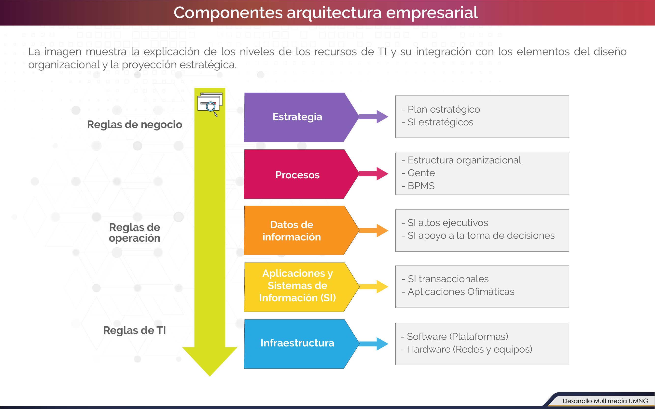 - Presentar el concepto y los componentes de una arquitectura empresarial y su relación en la gestión por procesos.