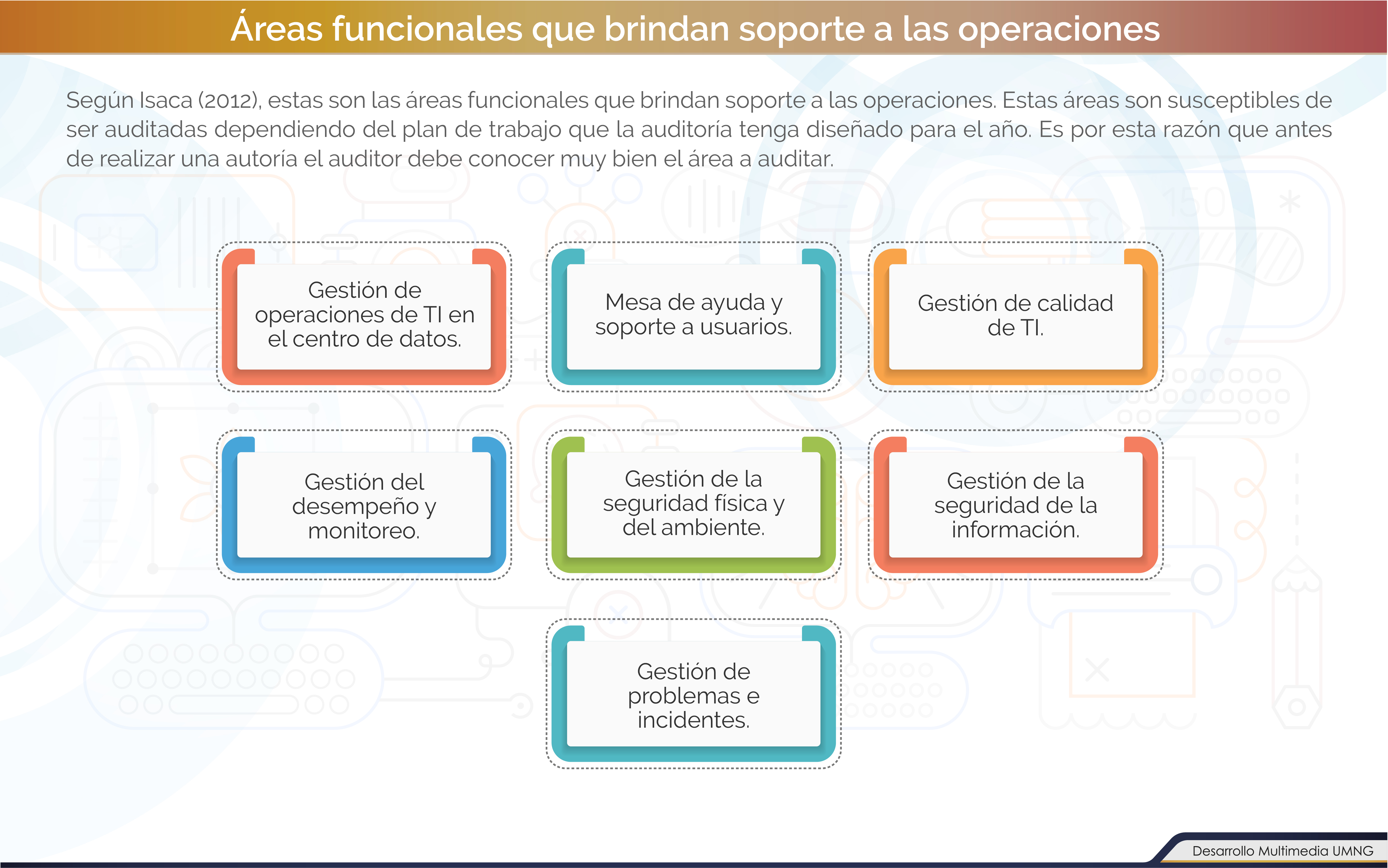 Posteriormente nos enfocaremos en los procesos de adquisición, desarrollo e implementación de los sistemas de información y en las operaciones, mantenimiento y soporte de dichos sistemas.