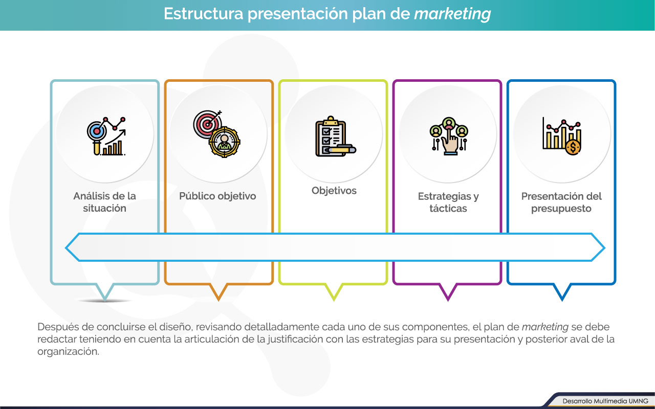 Dicha presentación deberá tener como características fundamentales el desarrollo de los siguientes siete componentes articulados y evidenciados en dicho proceso los cuales garanticen el logro de los objetivos y finalidad del plan, permitiendo el logro del fin establecido para la socialización del plan de marketing; es decir su aprobación.