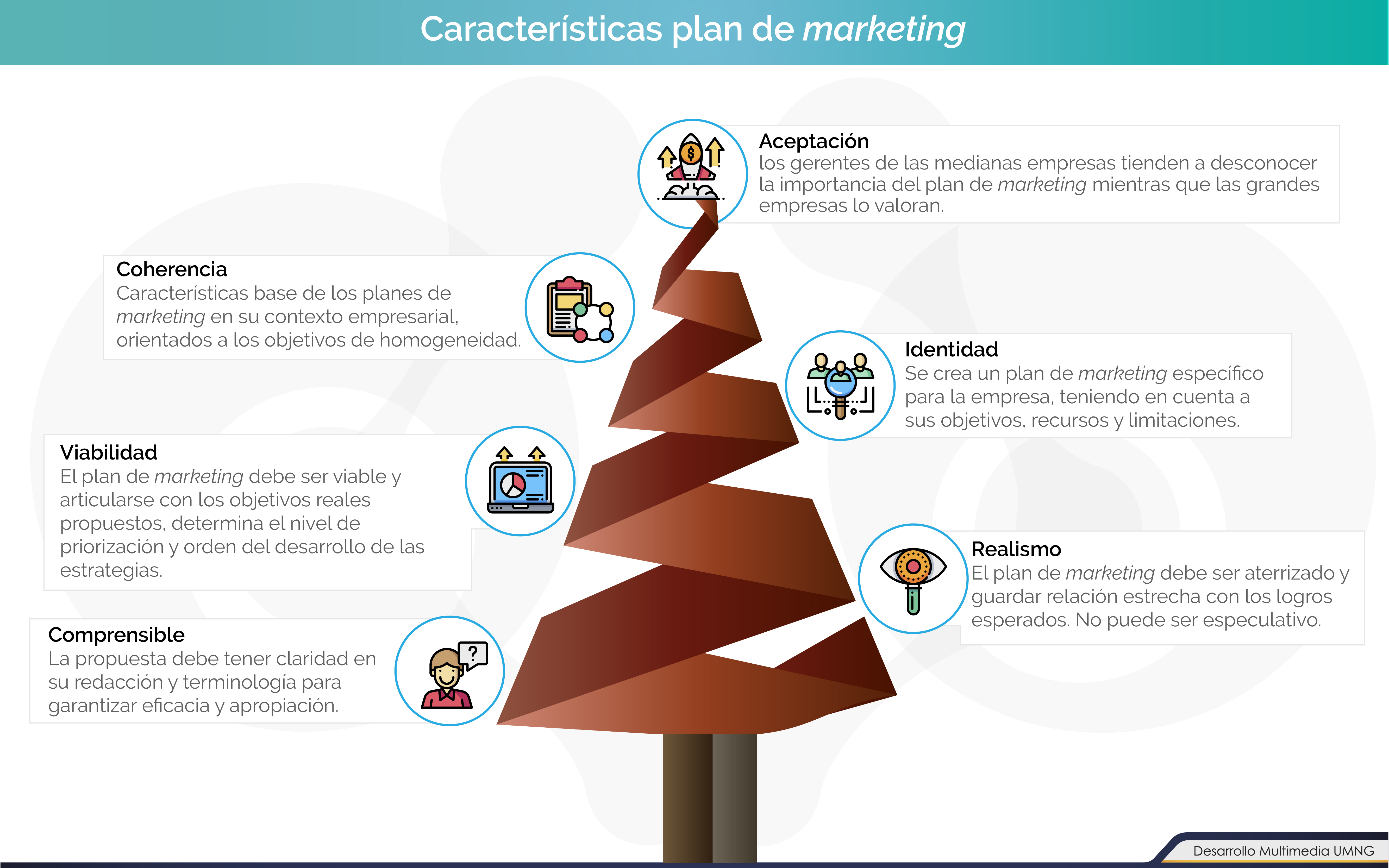 El plan de marketing se caracteriza por ser flexible pero desarrollado de forma seria y coherente con las características organizacionales. Debe ser de fácil comprensión y siempre plantearse de forma escrita. Su presentación debe ser amigable, dinámica y clara. Su elaboración debe ser cuidadosa y amplia en función del alcance de los objetivos propuestos. Igualmente se debe evidenciar un nivel en su estructura temporal o periódica viable, abierto a procesos permanentes de mejora, con el fin de ampliar su capacidad de eficacia frente a los intereses organizacionales. |
