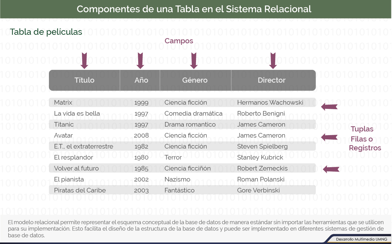 Una tabla está compuesta por un conjunto de atributos denominados «campos», las filas de datos se denominan «tuplas» o «registros» y cada tupla dentro de una tabla debe ser única.