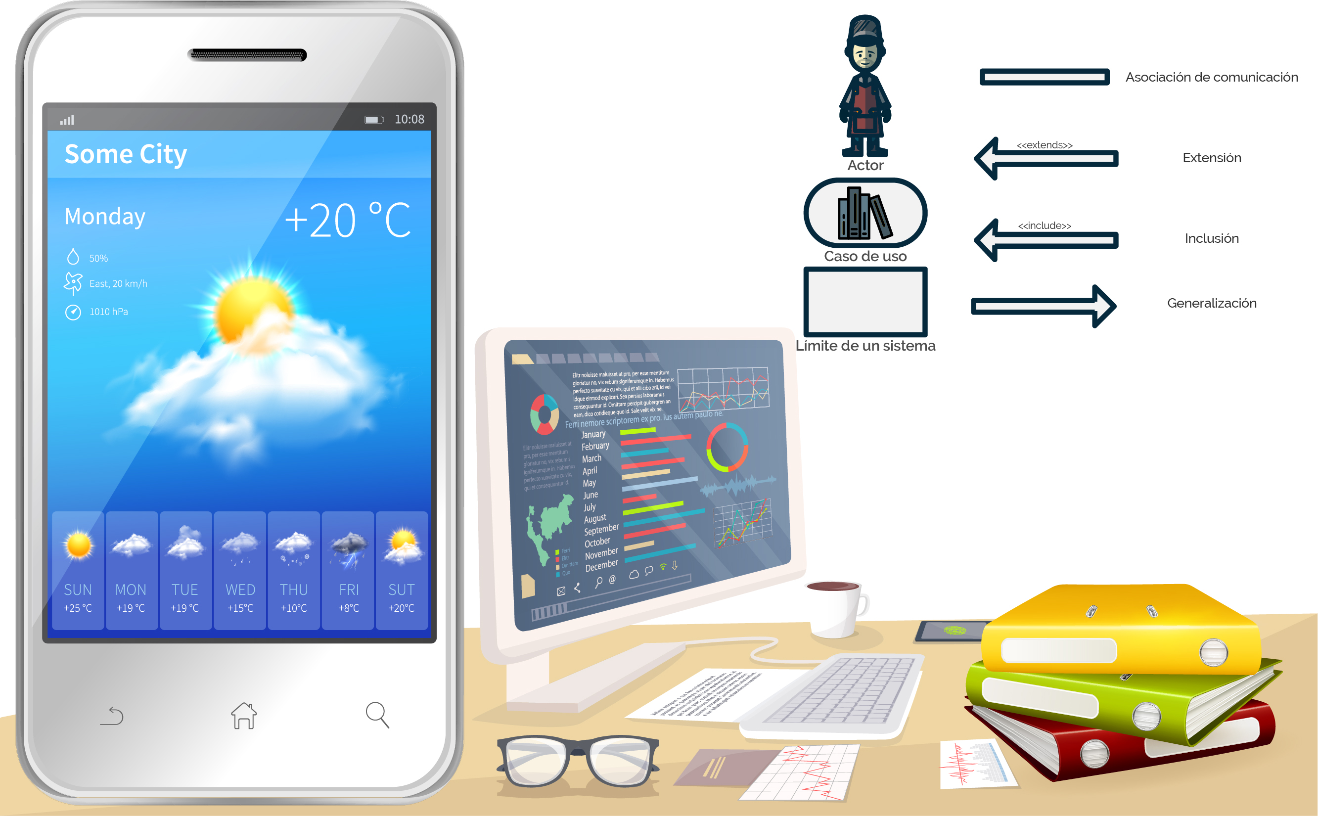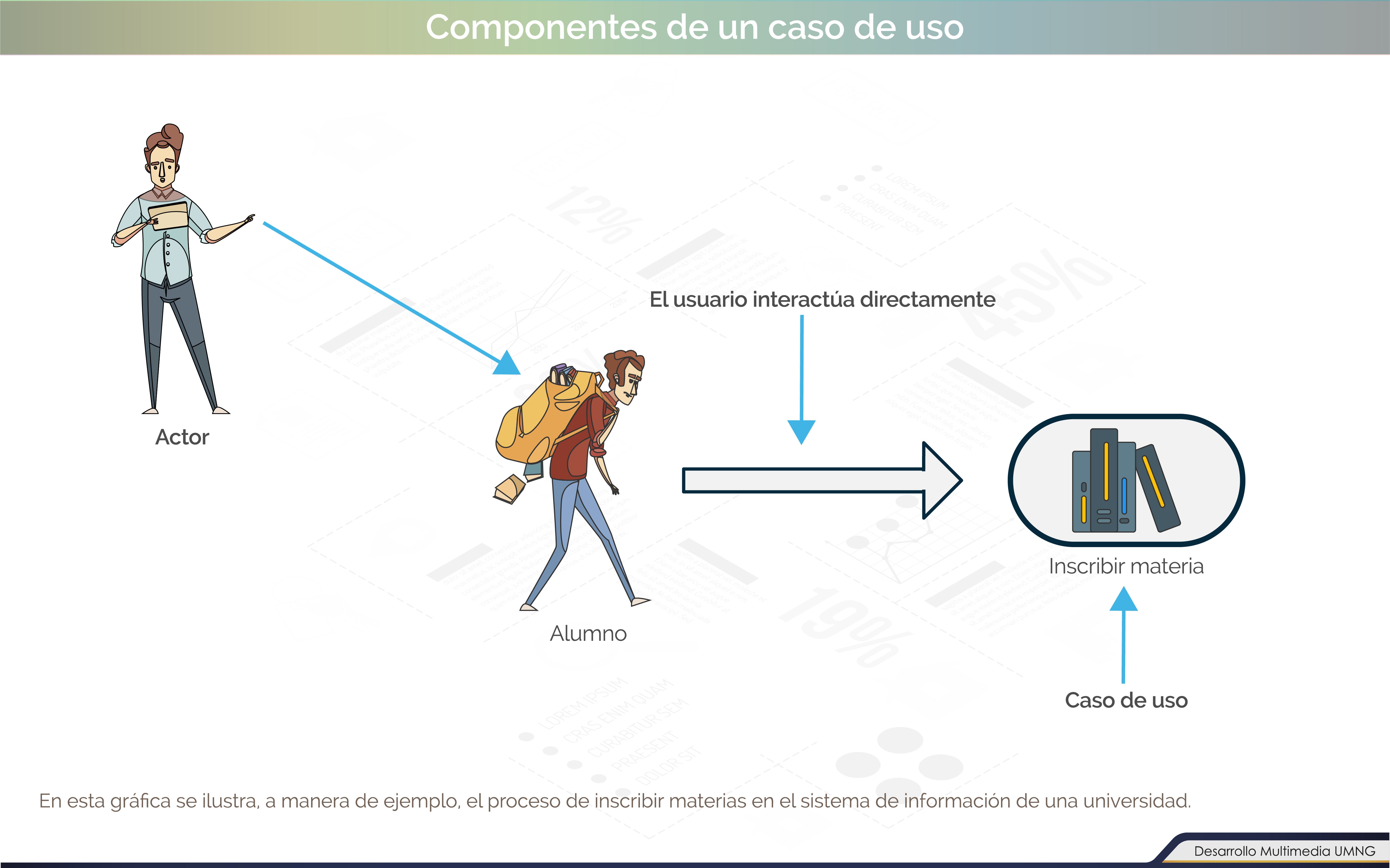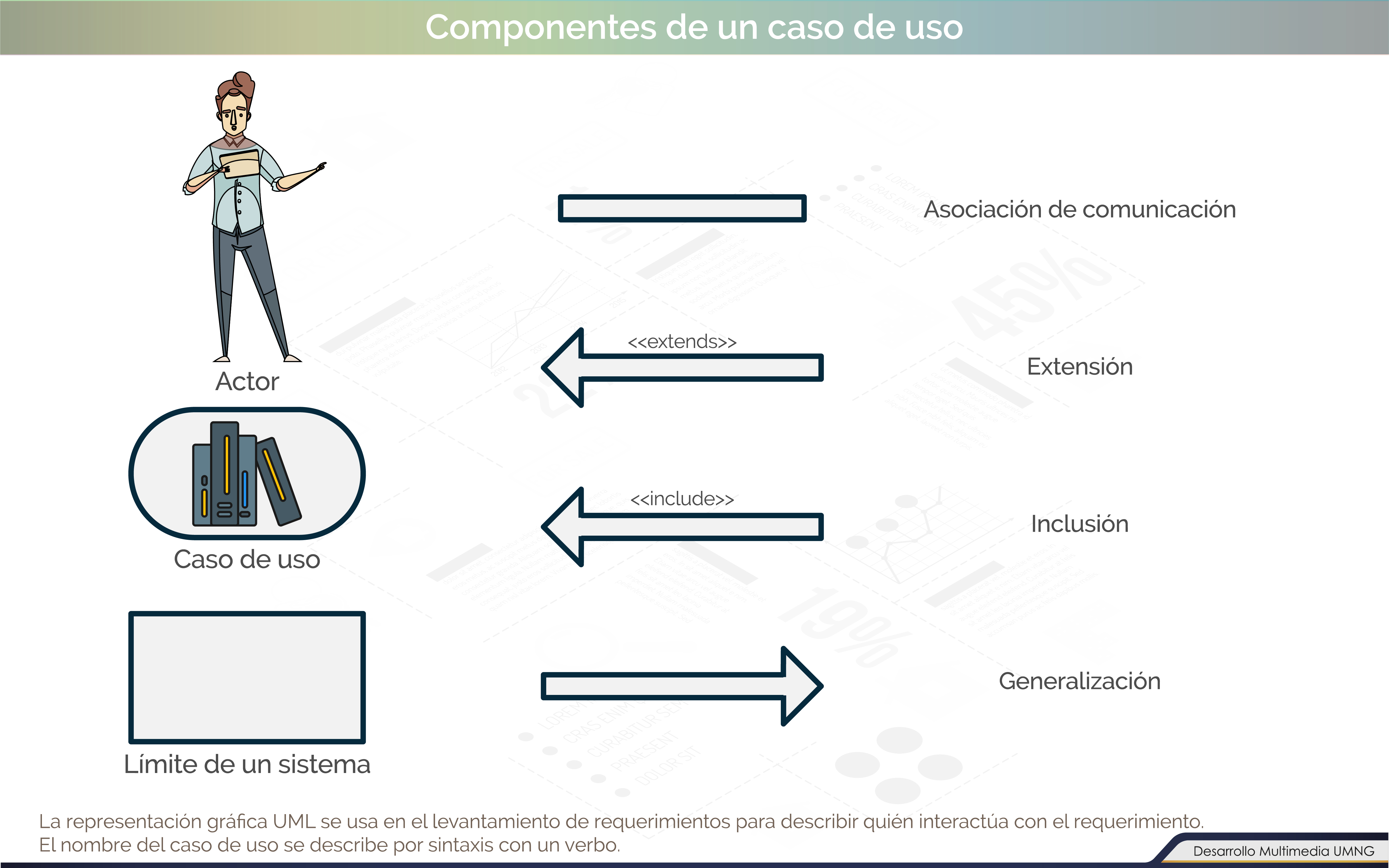 En las imágenes que aparecen en pantalla se ilustran los elementos básicos de esta representación para el levantamiento de requerimientos.