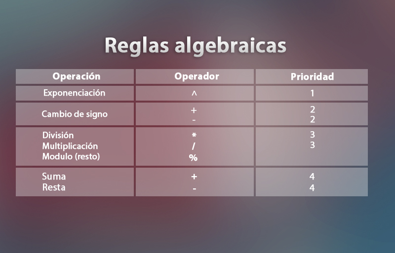 Los algoritmos y en consecuencia los programas, se componen de datos, sentencias y expresiones, ésta última representada generalmente por una ecuación matemática compuesta por uno o varios operadores y operandos.