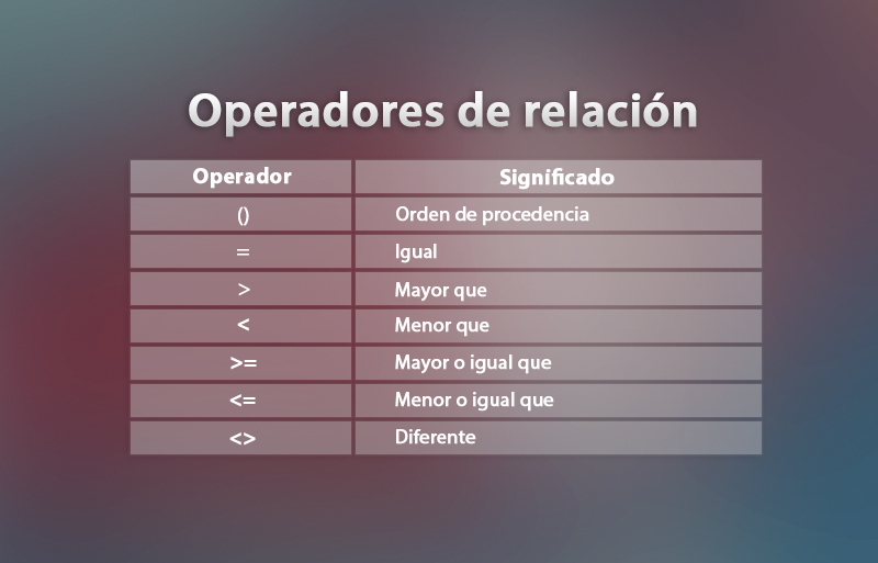 Operadores relacionales: permiten hacer comparaciones entre valores o expresiones de tipo numérico o carácter, y su resultado podrá ser verdadero o falso.