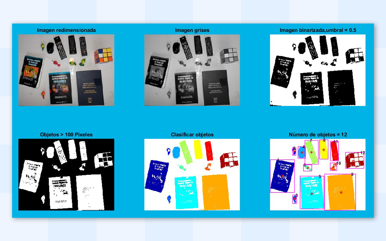 Se determina el número de pixeles o el área de los objetos que se van a clasificar y las áreas que se van a eliminar del proceso. Para determinar los pixeles que están en vecindad se niega la matriz binaria, este recurso matemático permite identificar los pixeles que están en vecindad y tienen conectividad para formar objetos. El número de pixeles de los objetos permite filtrar los que no se desean procesar como: el ruido que se origina en los dispositivos de captura o en el desenfoque al tomar fotografías, delimitar los objetos de interés y desechar los de bajo interés.