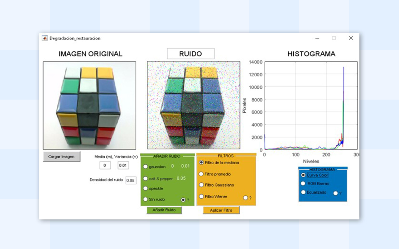 En el siguiente video se presenta la utilización de una aplicación que permite variar los diferentes parámetros para degradar las imágenes, al aplicarle ruido y ver en tiempo real los efectos sobre la imagen y sobre las matrices, se utiliza una imagen de tamaño 10x10 para poder analizar los cambios de datos que se producen en los pixeles de las tres matrices RGB. Se implementa en la misma aplicación los filtros que ayudan a restaurar la imagen, permitiendo variar los parámetros de los filtros y experimentar el efecto que se logra con las modificaciones. |