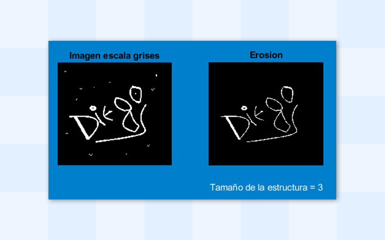 Es útil para remover de las imágenes ruido pequeño y disperso, para utilizar esta técnica se debe definir la estructura del elemento morfológico que indica la forma de la máscara, que se va a utilizar para reducir o encoger la imagen a la cual se le aplica la erosión.