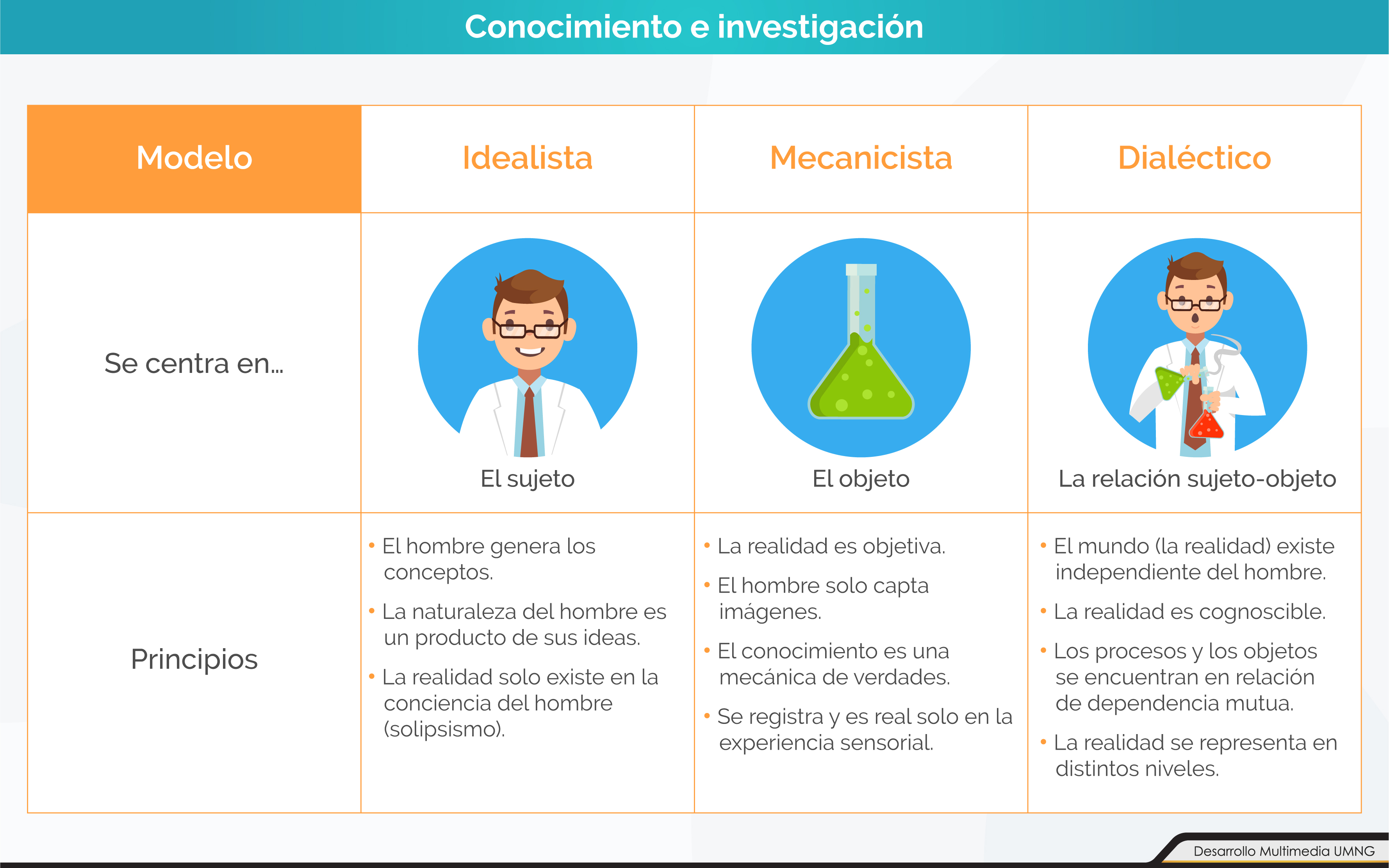 Existen tres modelos que explican el conocimiento de la realidad: el idealista, el mecanicista y el dialéctico. Haga clic sobre el siguiente enlace para acceder a sus respectivas definiciones.