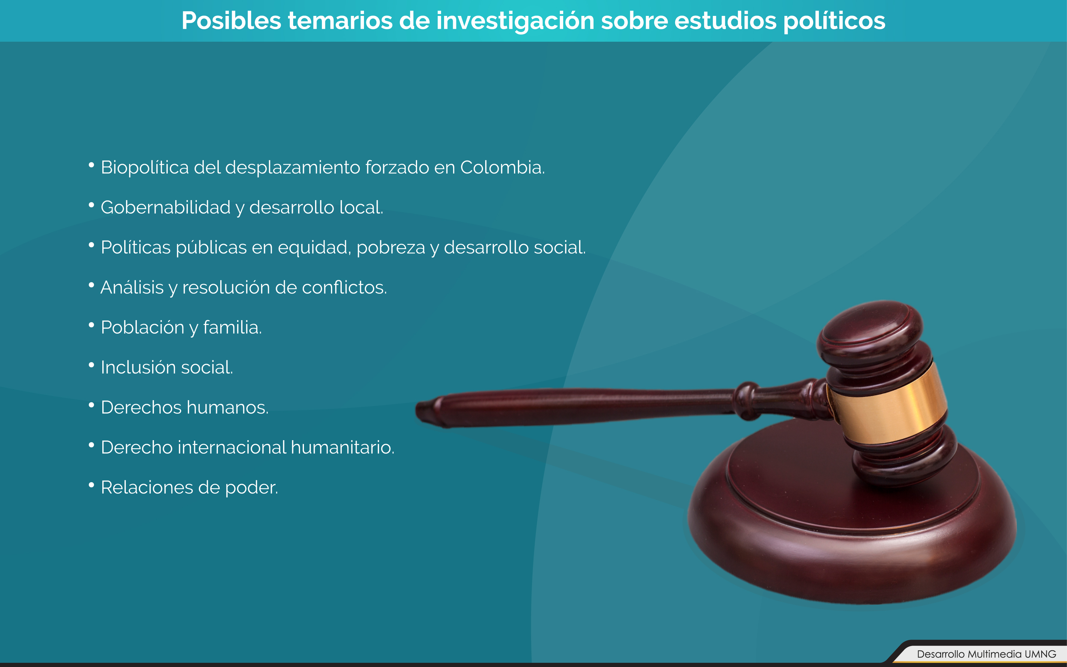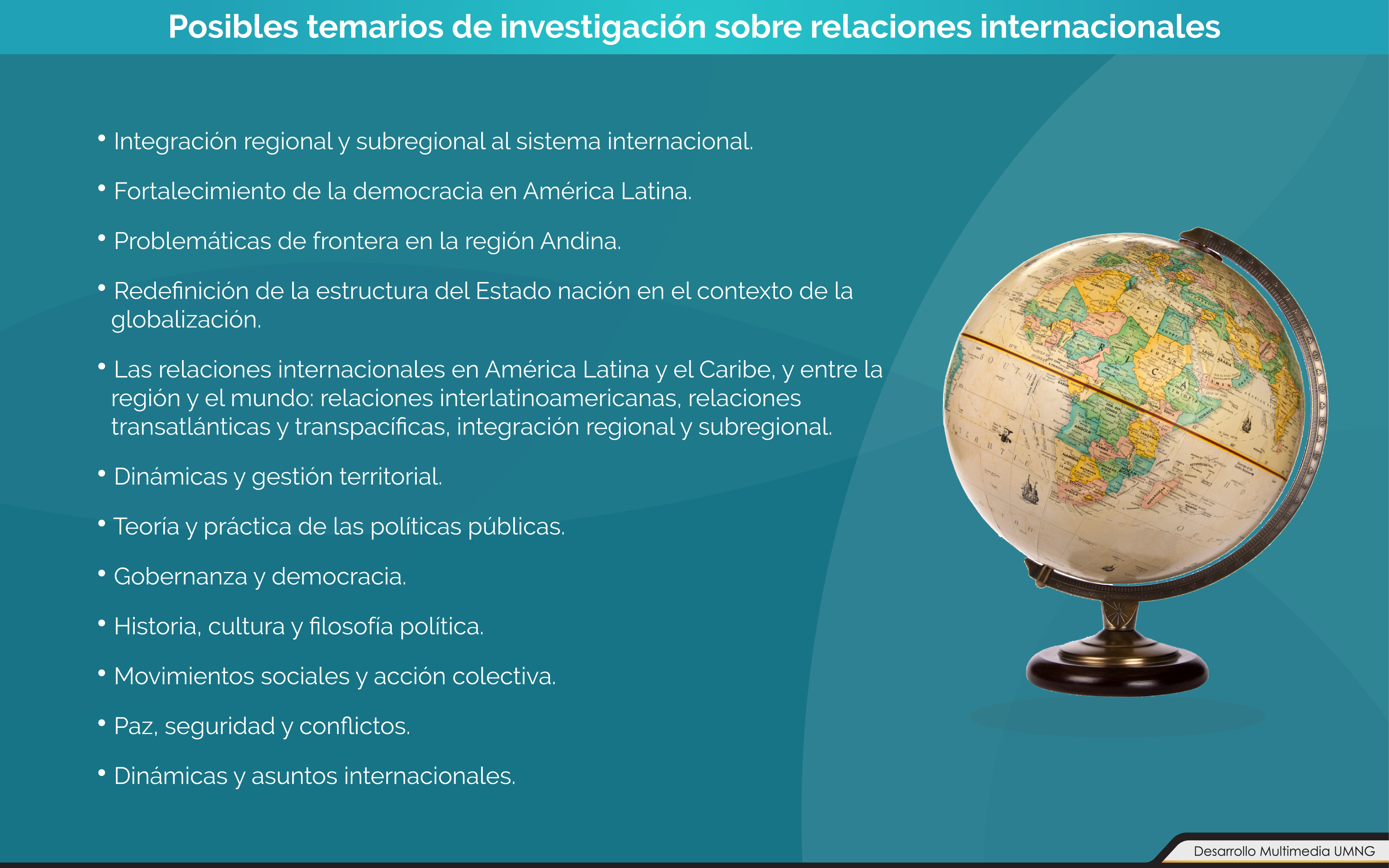 En este último apartado se exponen algunos de los temas de investigación que se pueden abarcar en el marco del programa de Relaciones Internacionales y Estudios Políticos a distancia de la UMNG.