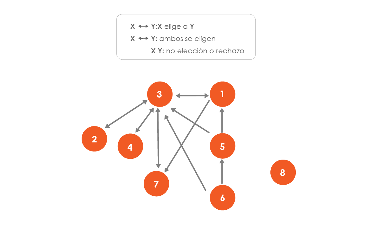 Como puede observarse en la matriz sociométrica, el empleado 1 eligió favorablemente al 3 y al 7; rechazó al 2 y al 5; fue rechazado por el 2, y con él son indiferentes los empleados 4, 6, 7 y 8.