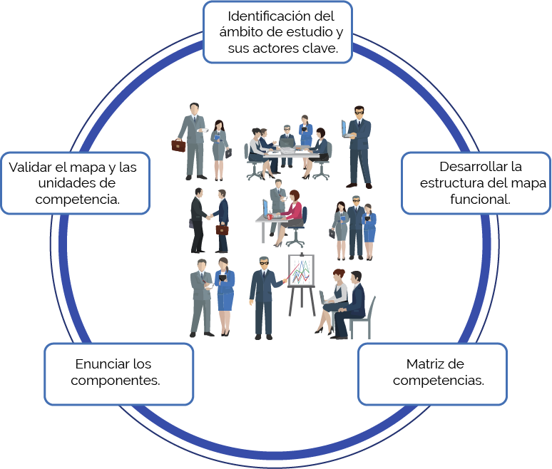 - Participar en el grupo interdisciplinario compuesto por expertos metodólogos en el diseño de competencias, empresarios, trabajadores, y representantes del Estado, de los gremios y de las instituciones educativas. En el contexto colombiano, estos grupos de trabajo se denominan mesas sectoriales.