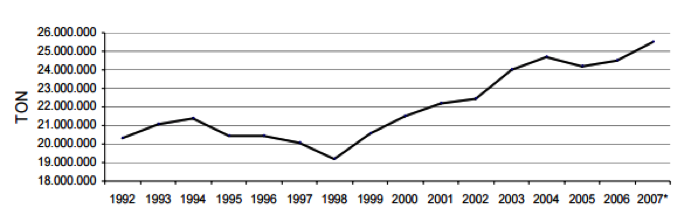 De acuerdo con el Ministerio de Agricultura y Desarrollo Rural, en términos generales, el país tiene una oferta estable y suficiente de alimentos. Este hecho se evidencia en el comportamiento de la producción agropecuaria, la cual ha presentado una tendencia creciente, después de la fuerte caída que se presentó a finales de los años noventa (figura 2). Sin embargo, la balanza comercial del país en términos de producto, ha presentado para este mismo periodo una tendencia negativa, lo que indica que cada vez el país importa más alimentos.