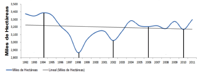 Contrasta el crecimiento que refleja la producción centrada en la cantidad de alimentos producidos con la cantidad de hectáreas cosechadas en Colombia, que fue evaluada por Beltrán & Piñeros en 2013 (figura 3), quienes pudieron concluir que existe realmente una tendencia decreciente de ella con un crecimiento negativo del -0.06% entre 1992 y 2011, aunque con una oscilación considerable y una desviación estándar de 4,76% frente a un promedio de 3.197.469 hectáreas.