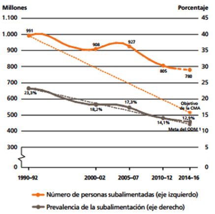 El 27 de mayo de 2015, la FAO publicó en su portal que hay unos 795 millones de personas subalimentadas en el mundo, es decir: 167 millones menos que hace un decenio y 216 millones menos que en 1990-92. El descenso ha sido más pronunciado en las regiones en desarrollo, a pesar del considerable crecimiento demográfico (figura 4). Sin embargo, en otra publicación de las Naciones Unidas, en 2013, (http://www.un.org/es/globalissues/food/), se lee que “el número de personas hambrientas en el mundo sigue siendo inaceptablemente elevado, casi 870 millones en el año 2012. De ellos, la gran mayoría vive en países en desarrollo, unos 850 millones, poco menos del 15 % de la población”.