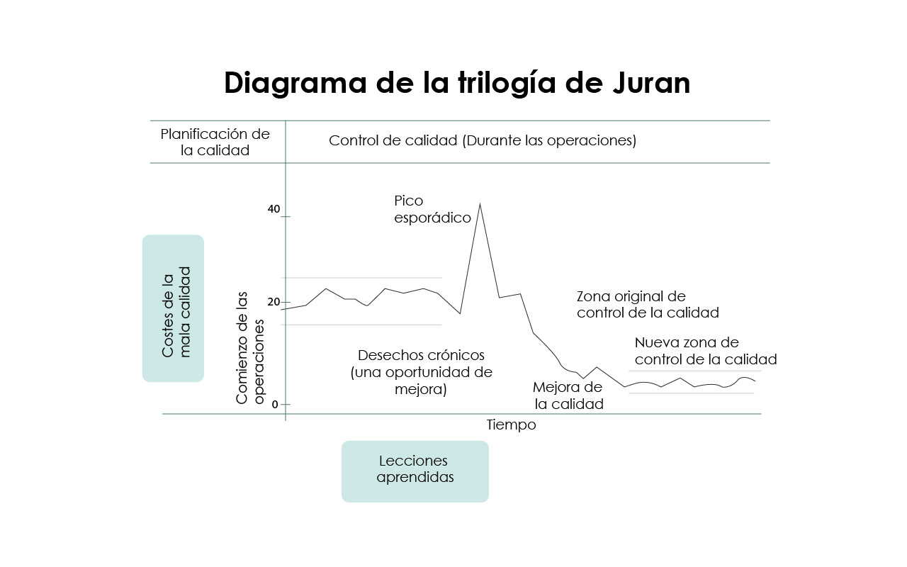Juran es conocido también por desarrollar la trilogía de la calidad compuesta por la planificación, el control y la mejora de la calidad. En el gráfico se puede observar la conexión entre los tres aspectos que componen dicha trilogía: