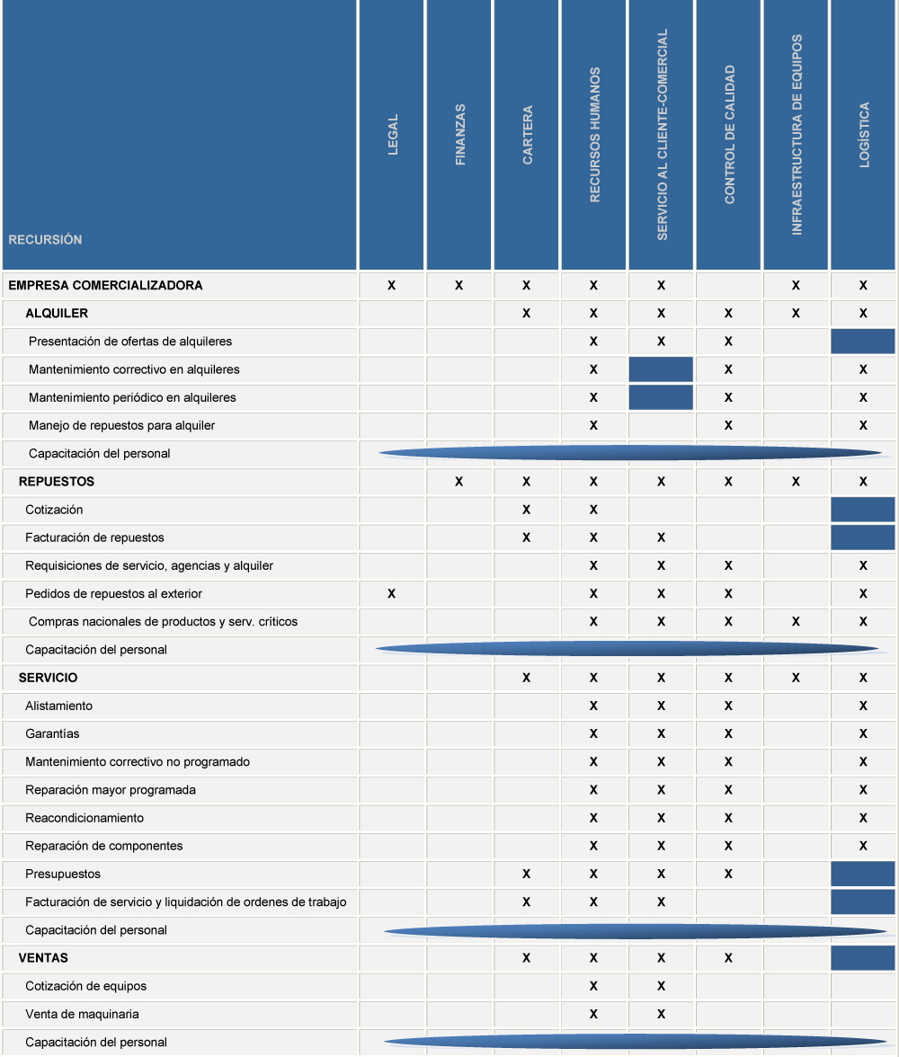 Al revisar los cruces por filas, se encuentra que hay actividades primarias que no tienen actividades de apoyo relacionadas, lo cual es un vacio, que requiere ser llenado, pues no existe la debida delegación y sí la centralización que puede estar redundando en decisiones fuera de contexto y cuellos de botella.