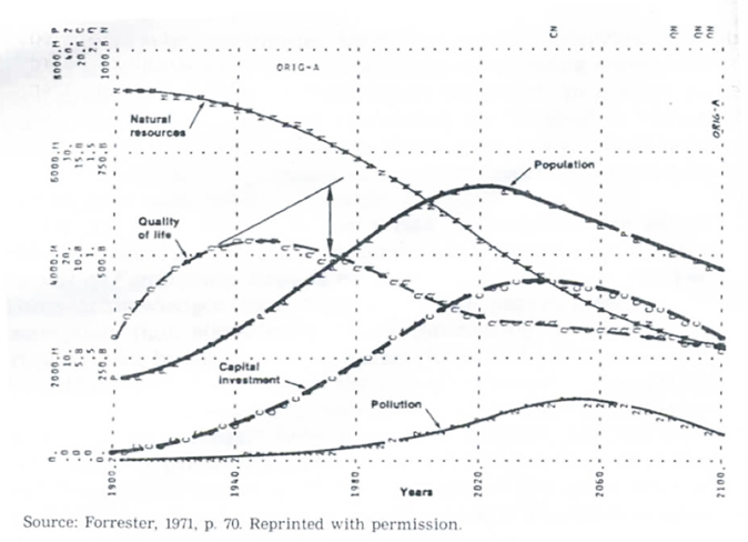 El comportamiento que se observa de cada curva es de muy largo plazo, en el período 1900 – 2100. Las conclusiones son evidentes; lo que con toda claridad dice este modelo dinámico es que el actual modelo de desarrollo basado en la sobreexplotación de los recursos naturales y del talento humano, simplemente no es sostenible.