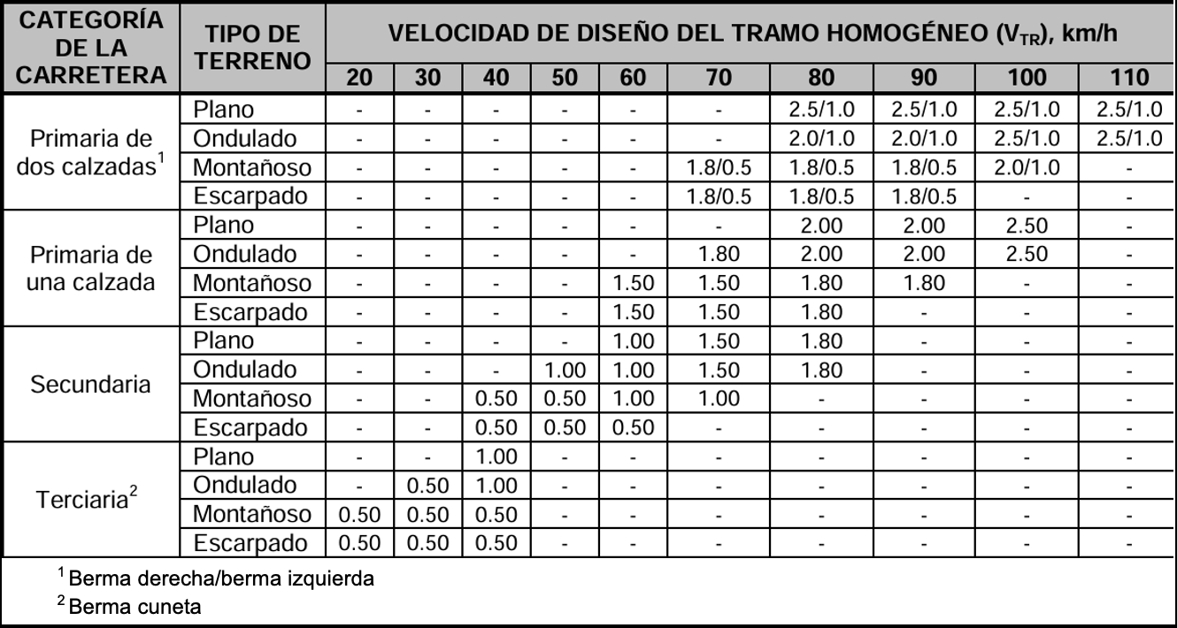 Teniendo en cuenta que las dimensiones de carril y calzada se determinan en función de la categoría de la carretera, en función de la velocidad de diseño definida para la misma, en las tablas siguientes del manual de diseño geométrico del Instituto Nacional de Vías se pueden seleccionar las dimensiones mínimas para la calzada y para las bermas: