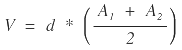 En la figura anterior las áreas de las secciones 1 y 2 son iguales (A1 = A2 = A) y simétricas respecto del eje, por lo que el centro de gravedad está sobre el eje vertical de la sección, por tanto el recorrido del centroide entre las secciones (d’) es igual a la distancia (d) medida entre las dos secciones sobre el eje. El volumen estará dado por la siguiente expresión: