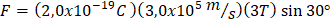 En un campo magnético de magnitud 3T se mueve en haz de protones con una carga q=2,0x10-19 C a una velocidad de 3,0x105 m⁄/s. Si el ángulo que se forma entre el campo magnético y la velocidad es 30°. Calcule la fuerza sobre el protón.