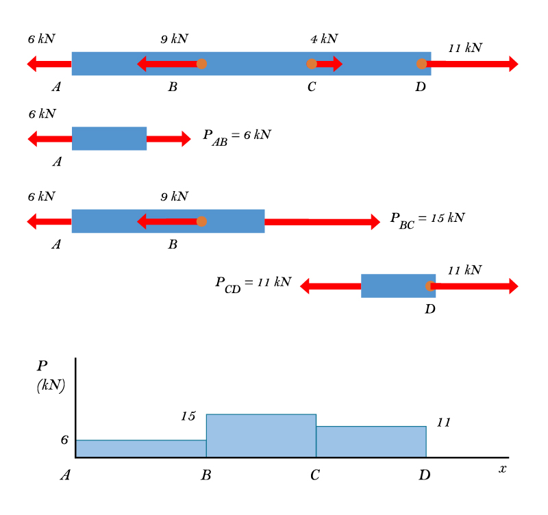 En el siguiente ejemplo se calcula el esfuerzo normal en diferentes tramos de un elemento: