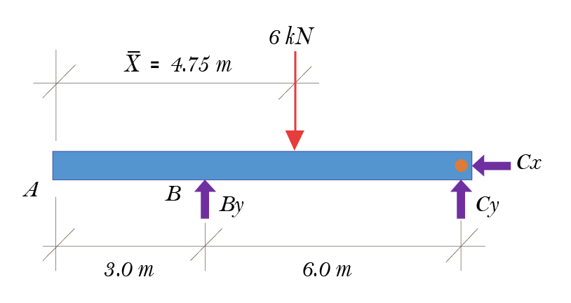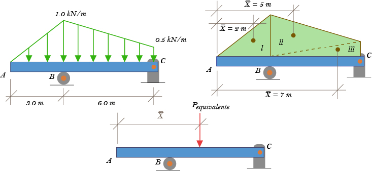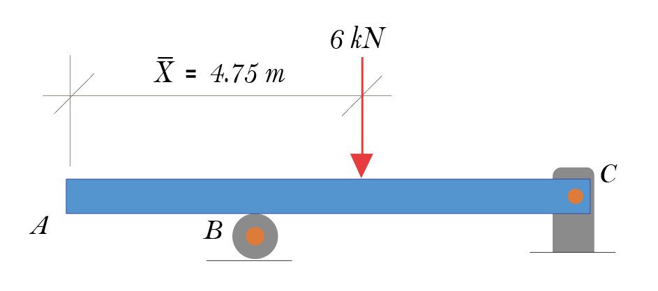 Por tanto, \bar{X}\sum A=\sum \bar{x}A;~~~\bar{X}\left( 6.0kN \right)=28.5kN.m;~~\bar{X}=4.75~m. La carga equivalente es \text{W}=6\text{kN}\downarrow.