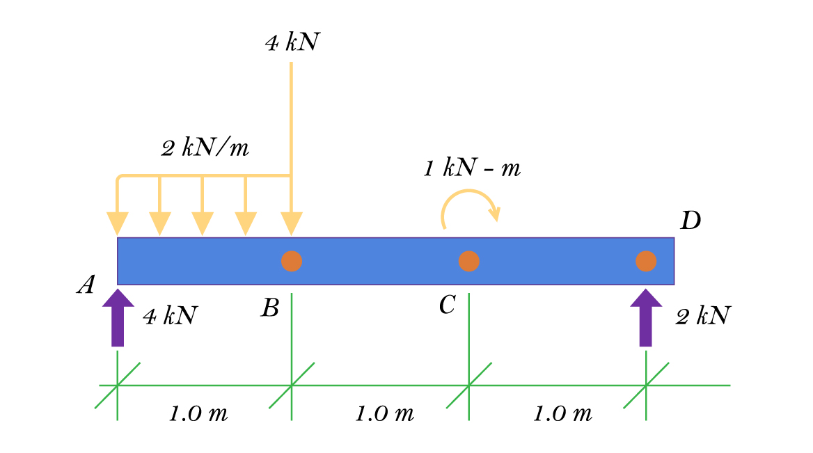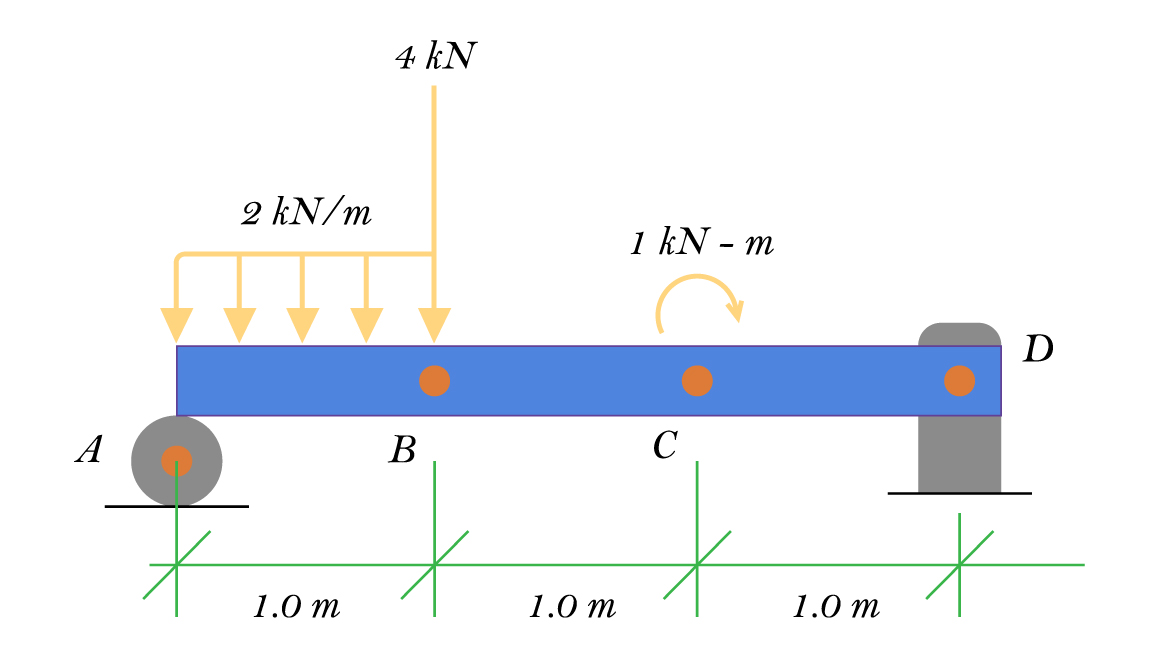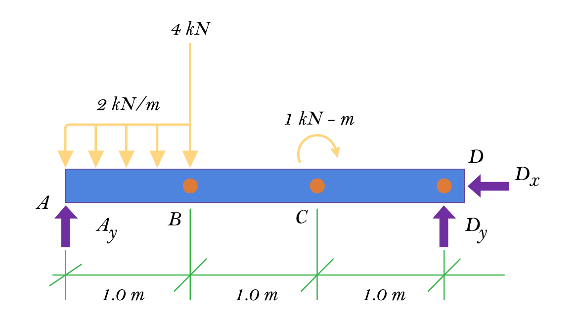 -\left( 2\frac{\text{kN}}{\text{m}}\text{* }\!\!~\!\!\text{ }1.0\text{ }\!\!~\!\!\text{ m} \right)*0.5~m-4\frac{kN}{m}*1.0m-1~kN*m~+{{D}_{y}}\left( 3.0~m \right)=0;~