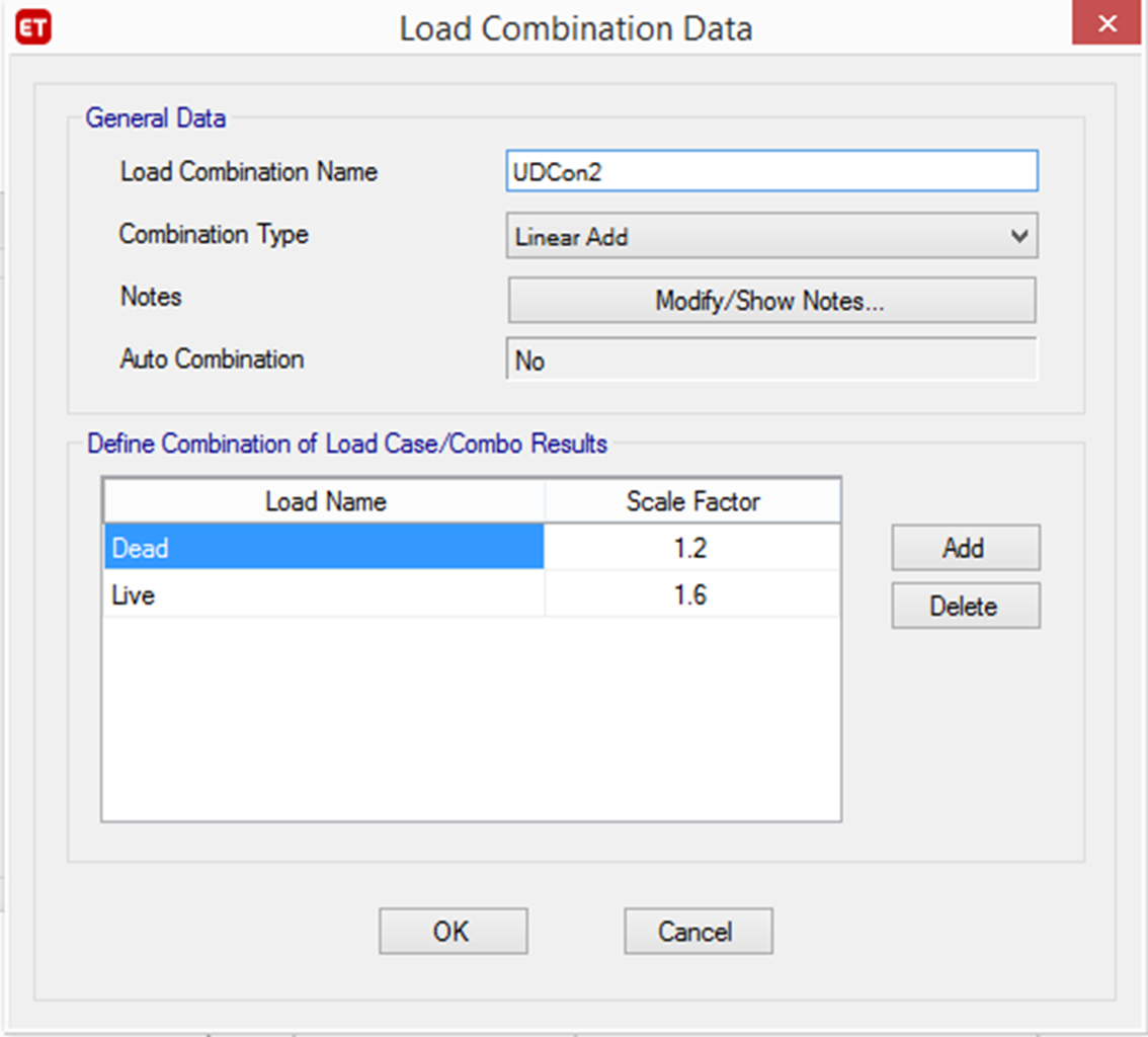 Combinaciones básicas de diseño generadas automáticamente, considerando carga muerta y viva.