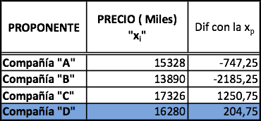 Para la asignación de una licitación se tendrá en cuenta el proponente que se encuentre más cerca del promedio del pecio propuesto, ponderado con los años de experiencia certificada en obras similares. Una vez abiertas las propuestas se tienen los siguientes datos:
