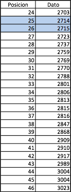 Según la posición, la mediana estará entre los datos de la posición 25 y 26. Entonces: