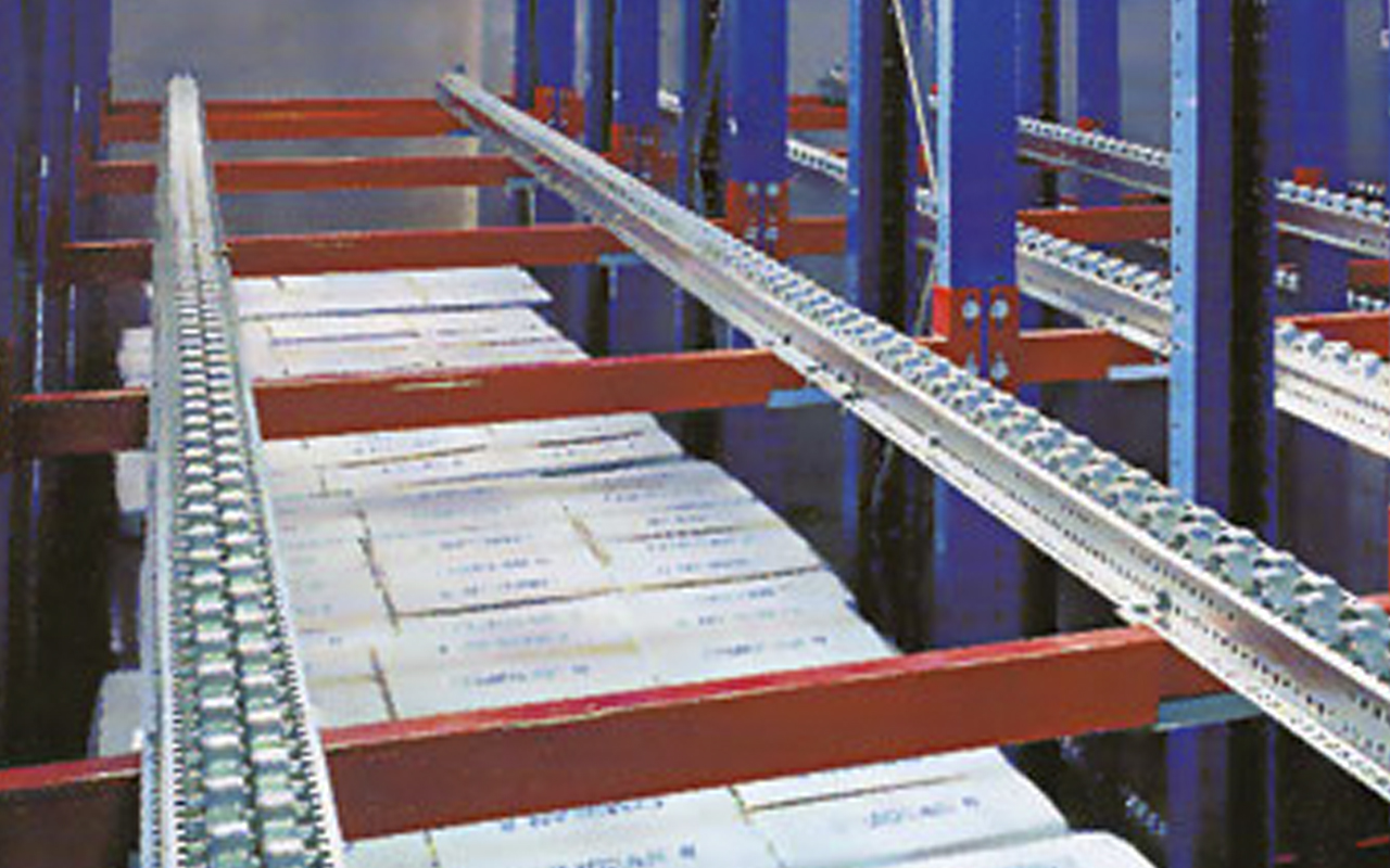 Utilizan largas pistas transportadoras capaces de soportar una fila de unidades de carga o superficies inclinadas. Las unidades de carga son cargadas por un lado del estante y descargadas por el otro, proporcionando una rotación de tipo first-in/first-out.