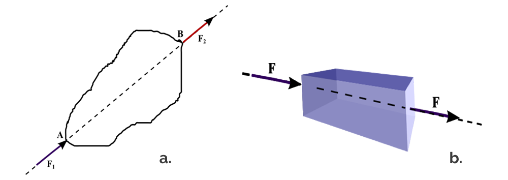 Ahora bien, en la imagen b), un bloque es empujado con una fuerza F, la cual es equivalente a atar el bloque de una cuerda y halarlo de la parte delantera. Así, el efecto ocasionado por la fuerza puede ser transmitido a lo largo de la línea de acción, sin importar el punto de aplicación.
