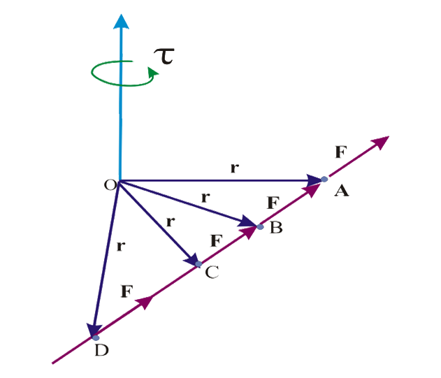 ¿Cómo se aplica el principio de transmisibilidad para el momento de una fuerza con respecto a un punto?. La punta del vector r se puede ubicar sobre cualquier punto de la línea de acción de F. Esto implica un momento de torsión igual para cualquiera de estos puntos, esto establece que F es un vector deslizante porque se ubica en cualquier punto de la línea de acción generando el mismo momento τ con relación al punto de giro O, ver la siguiente imagen: