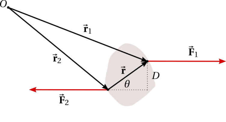 Las fuerzas F1→ y F2→ que actúan sobre el objeto, tienen la misma magnitud, líneas de acción paralelas y sentido contrario. Este tipo de fuerzas es conocido como un par o cupla, y se caracteriza porque su suma produce una fuerza neta igual a cero. Sin embargo, la adición de sus momentos de torsión alrededor de un punto O arbitrario es diferente de cero, y por lo tanto, el objeto sobre el que actúan tiende a rotar.