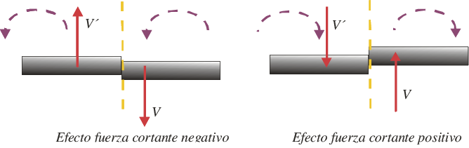 La convención para los signos de la fuerza cortante y del momento flector se establece mediante las siguientes consideraciones:- Las fuerzas cortantes son positivas si producen una rotación horaria del elemento y negativas si es antihoraria.