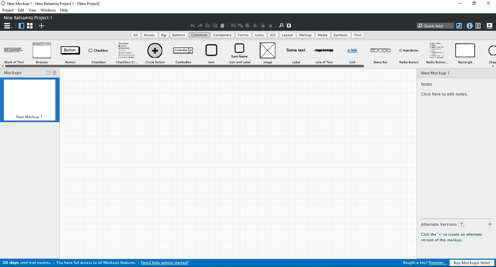 Una herramienta para la construcción de prototipo es: Balsamiq Mockups 3.5 (link de descarga gratis: https://balsamiq.com/download/). Esta herramienta será la que se utilizará para la construcción de prototipos. Su proceso de instalación es fácil y rápido. Se debe estar atento a la información que va solicitando y hacer clic en la opción adecuada. Una vez se termina el proceso de instalación, este abrirá la ventana para su utilización como se visualiza en la imagen.