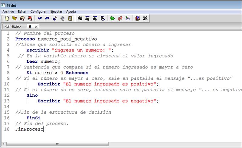 En el siguiente ejemplo se toma el ejercicio que determina si un número ingresado por el usuario es positivo o negativo, debidamente documentado en el programa PSeInt. Como se puede observar, los comentarios inician con los caracteres “//” y el texto aparece de color gris.