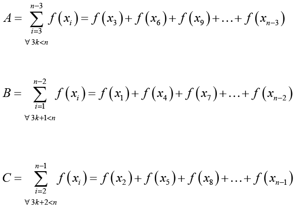 I=\underset{i=1,~impares}{\overset{n-1}{\mathop \sum }}\,f\left( {{x}_{i}} \right)=f\left( {{x}_{1}} \right)+f\left( {{x}_{3}} \right)+f\left( {{x}_{5}} \right)+\ldots +f\left( {{x}_{n-1}} \right)