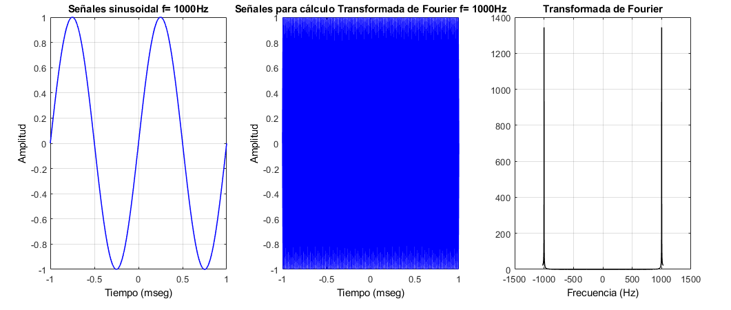 Figura de la señal de 1000 Hz y su transformada de Fourier.